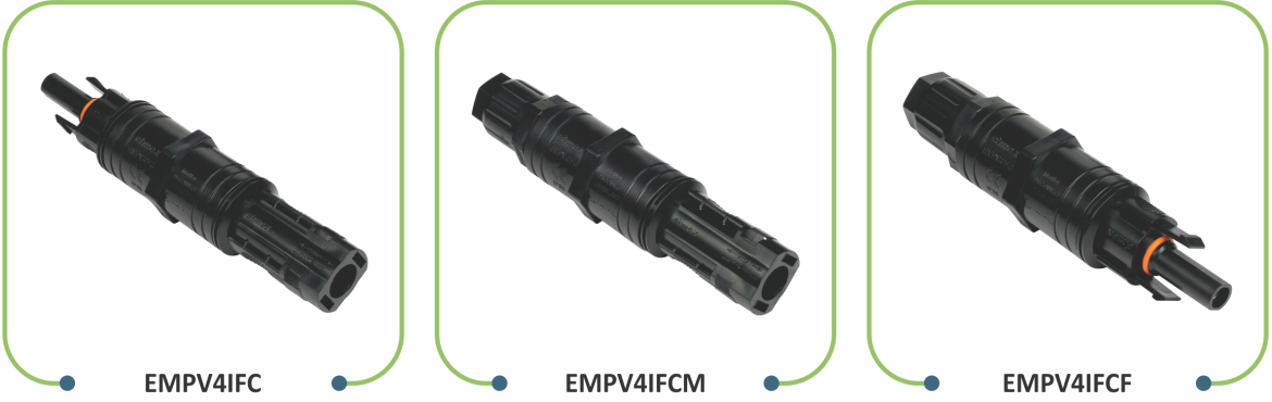 elmex PV Solar Straight Inline fuse connectors EMPV4IFC, EMPV4IFCM and EMPV4IFCF are applicable for Photovoltaic string protection. The variants of these connectors offer users with options of either using a male or female straight connector at one end and cable at the other end or using male/female straight connectors at both the ends for string protection with fuse. elmex straight inline fuse connectors have plug and socket design suitable for 2.5, 4.0, 6.0 mm² size cables and are constructed using fame retardant engineering thermoplastic suitable for exposure to UV rays and for application in PV power generation system.They are suitable for use with gPV(Cylindrical) fuse of ø 10 x 38 mm.